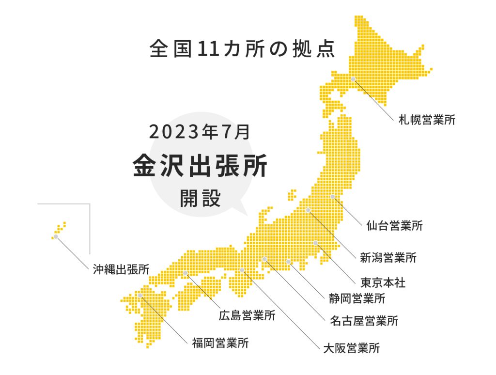 東京本社を中心に全国主要都市の札幌・仙台・新潟・静岡・名古屋・大阪・広島・福岡・沖縄に加えて、新たに2023年7月に金沢出張所を夢真は開設しました。全国11カ所の拠点で、夢真は建設現場をサポートしています。
