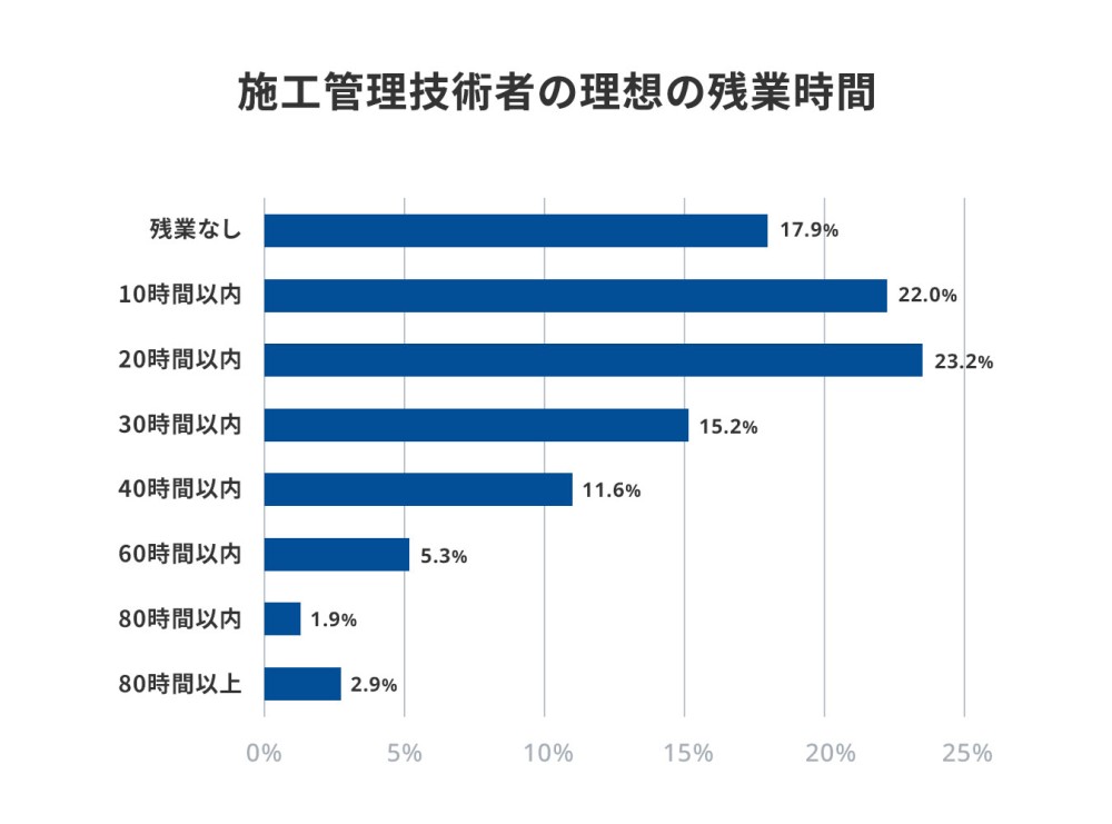 施工管理求人メディア「施工管理求人サーチ」のアンケート調査によると、施工管理技術者の約8割の理想残業時間は30時間以内です。技術者のパフォーマンス維持や、離職を防ぐうえでも残業時間を抑えることは大切だと考えています。